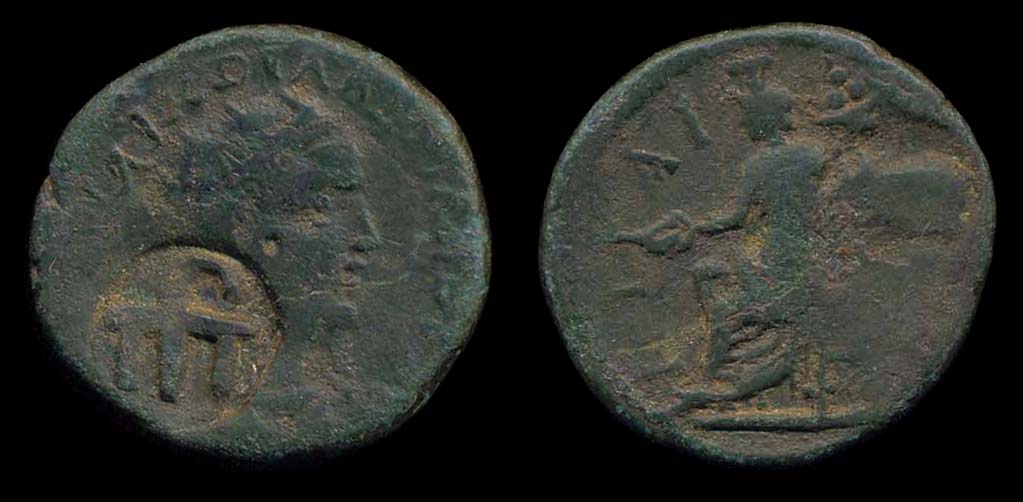 25mm bronze, SGI-nl, Howgego-629, bust R / Tyche seated L, countermarked