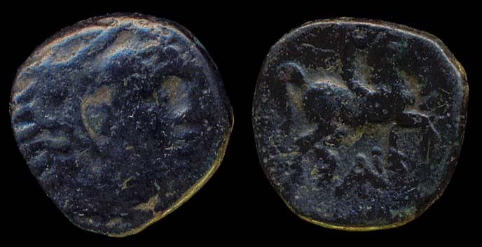 18mm bronze, SG-6698v, head of Apollo R / youth on horse R, AN monogram
