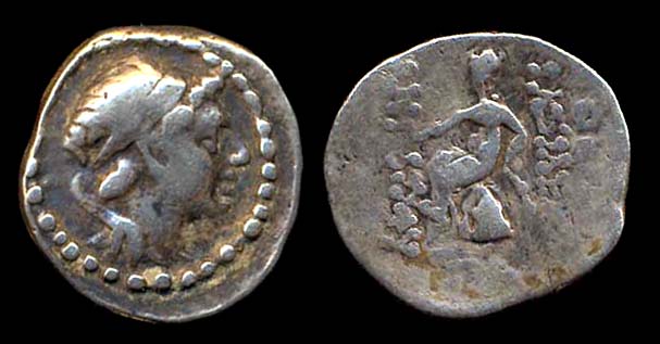 his head R / Apollo seated L, palm L, B-based monogram R, VF $125.00