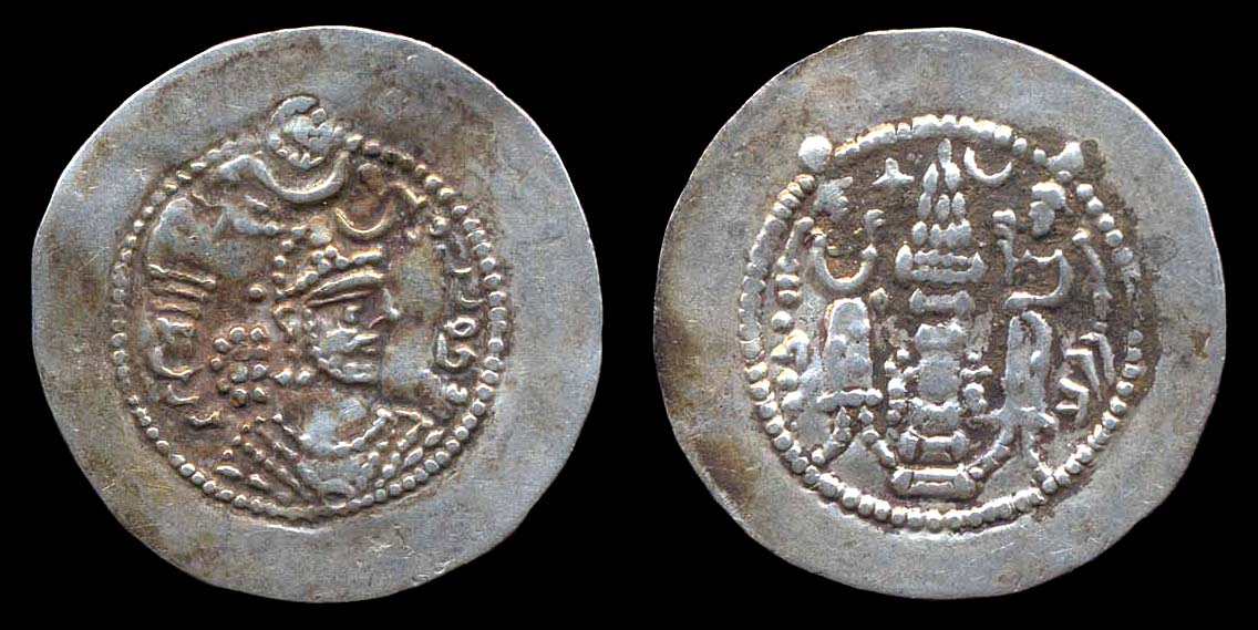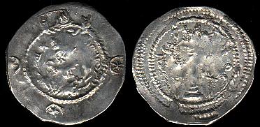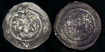 Khusrau II, 591-628, silver dirhams. The last of the Sasanian movers and shakers. Marauded all over, took Jerusalem, stole the True Cross and took it home (they lost it later). Got as far as Alexandria, where he issued coins.