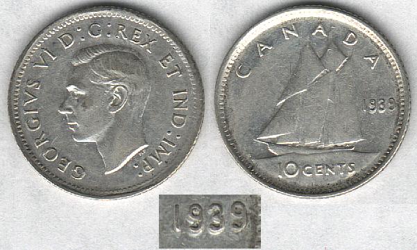 CANADA, 10 cents 1939 with strongly doubled date.  If this was a USA coin how much would it be worth?  XF, how about $45.00? sold
