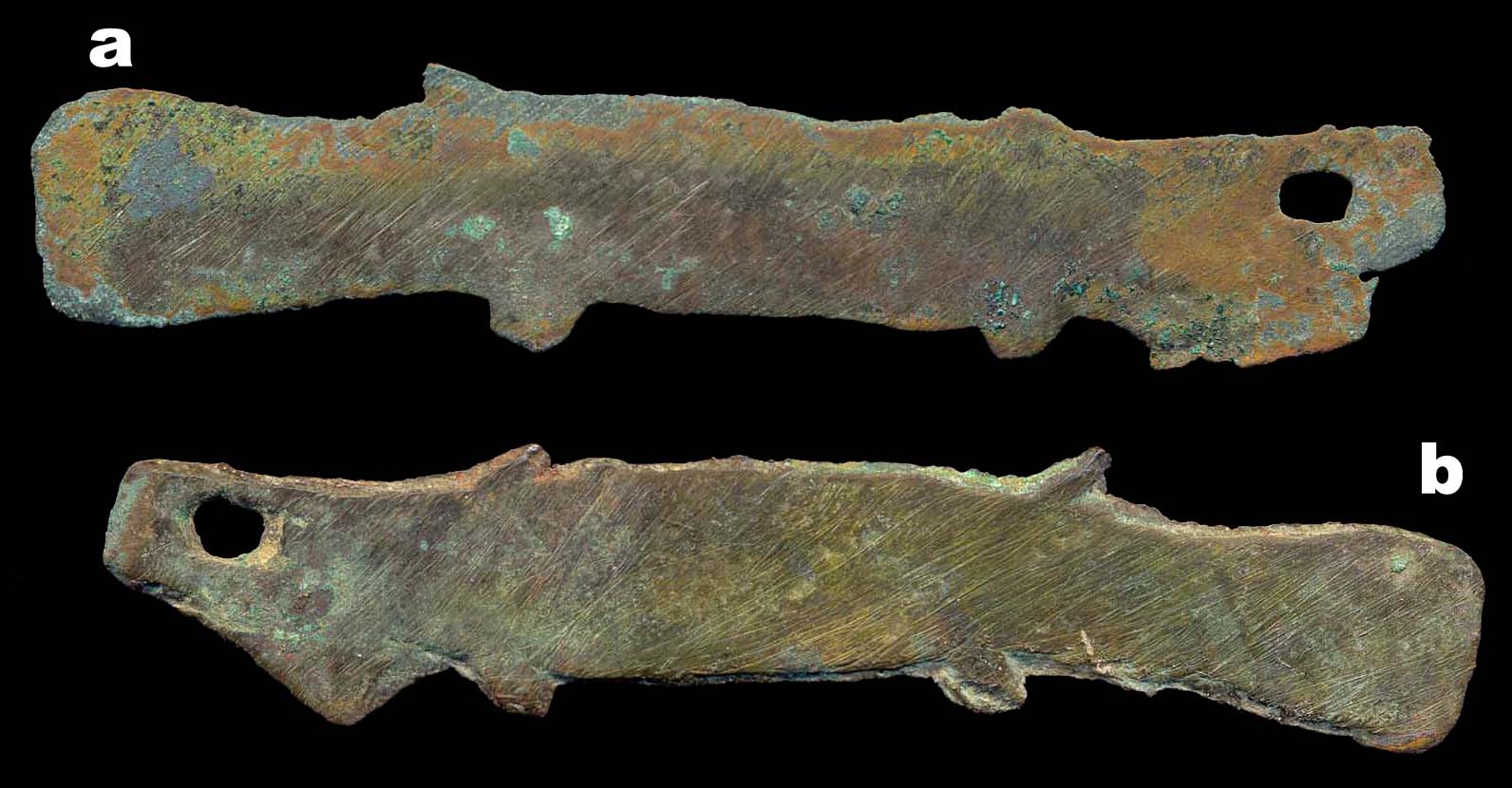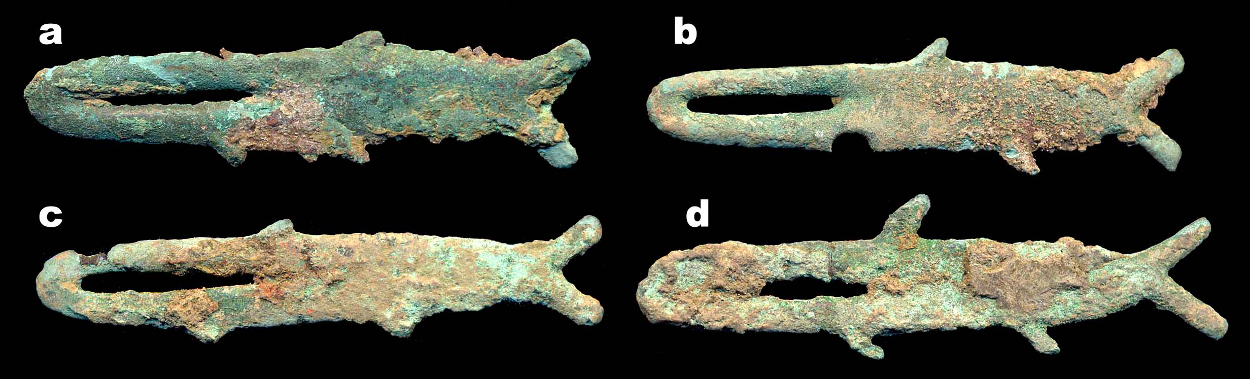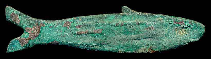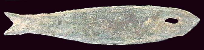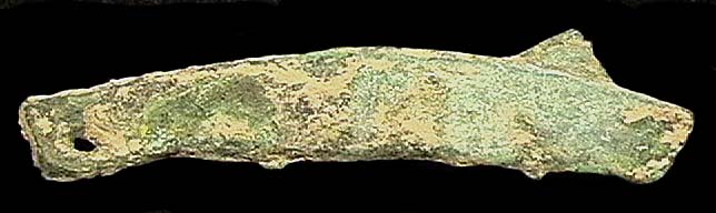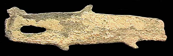 ZHOU Dynasty, 1122-255 BC, bronze fish, ~63x14mm, 1 top & 2 bottom