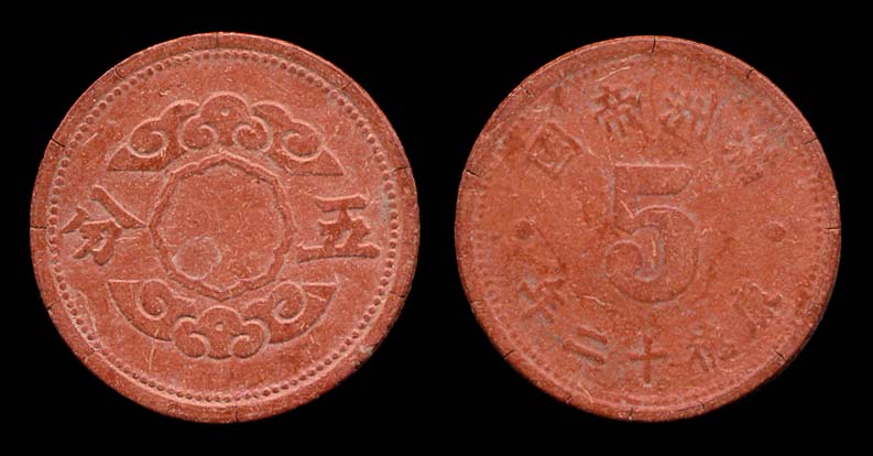 MANCHUKUO, 5 fen Y-A13a KT-12 bright red fiber, slightly warped,