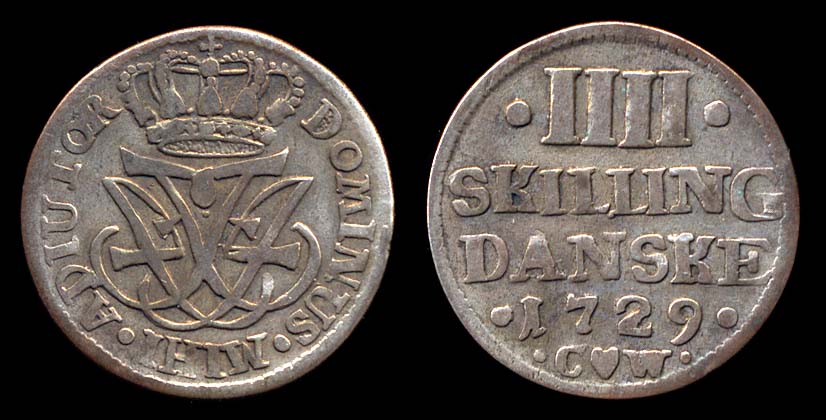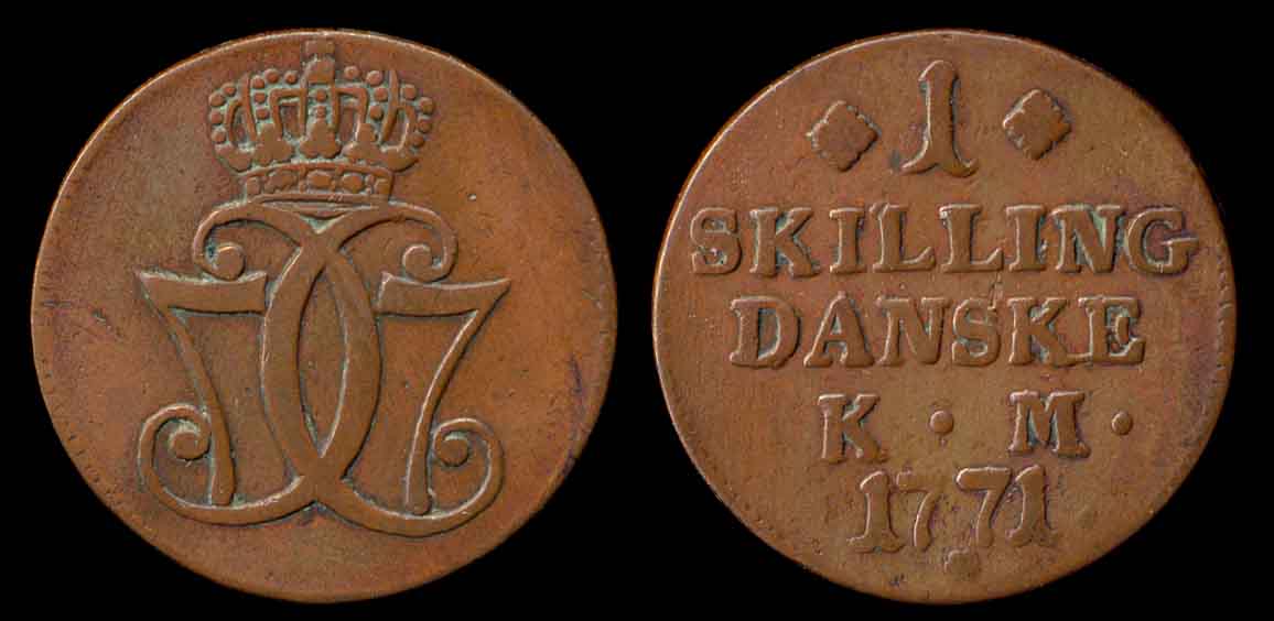 skilling, K615.3, 1771, C= 16mm tall, 7= 12mm, Copenhagen, VF $30.00