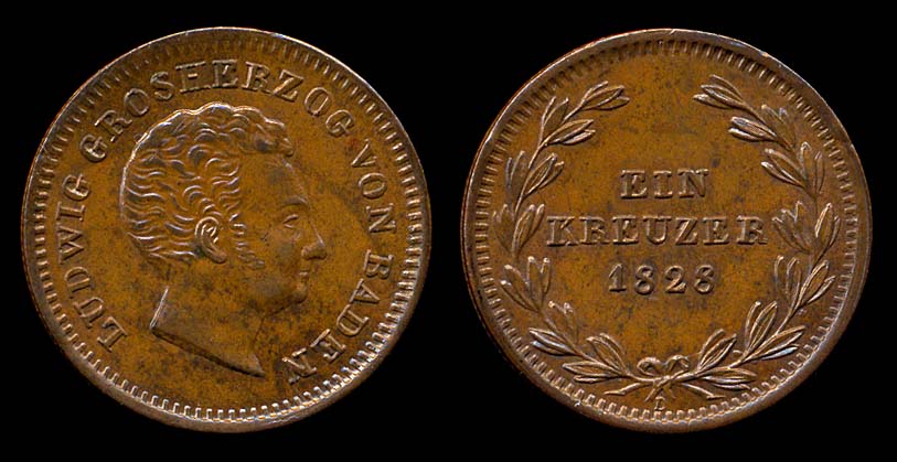 BADEN, 1 kreuzer K189 1828 choice XF $35.00