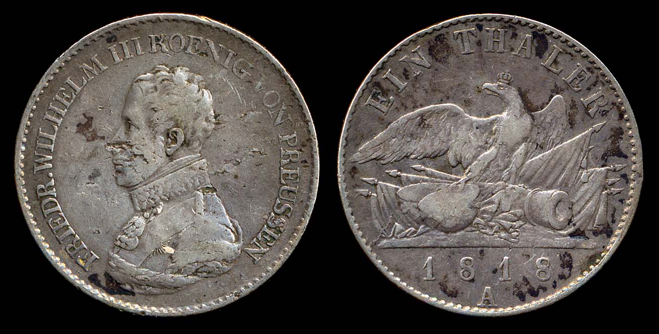 PRUSSIA, 1 thaler K387 1818-A flaws, F+ $30.00