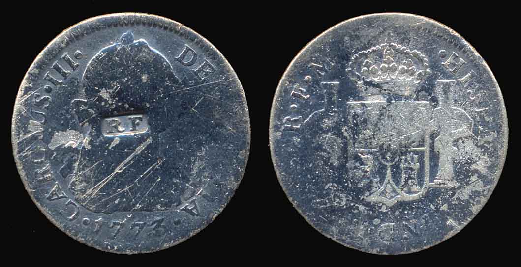 2 reales 1773-FM, Mexican coin c/m RF in 5x2mm rectangle, this is a well