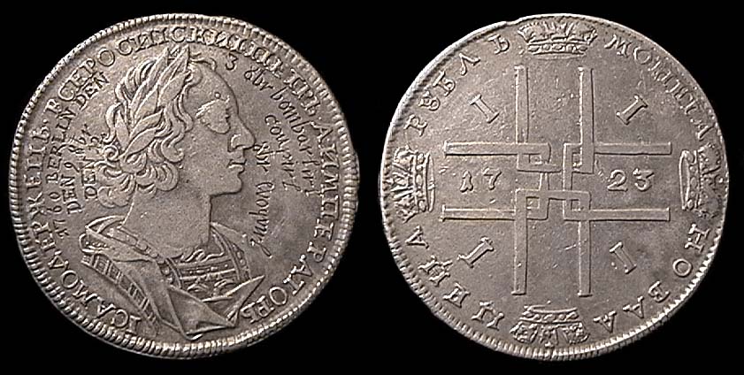 ruble, K162.2, D-1657, 1723 obv. engraved: 1760 BERLIN DEN 3 8br bombardird