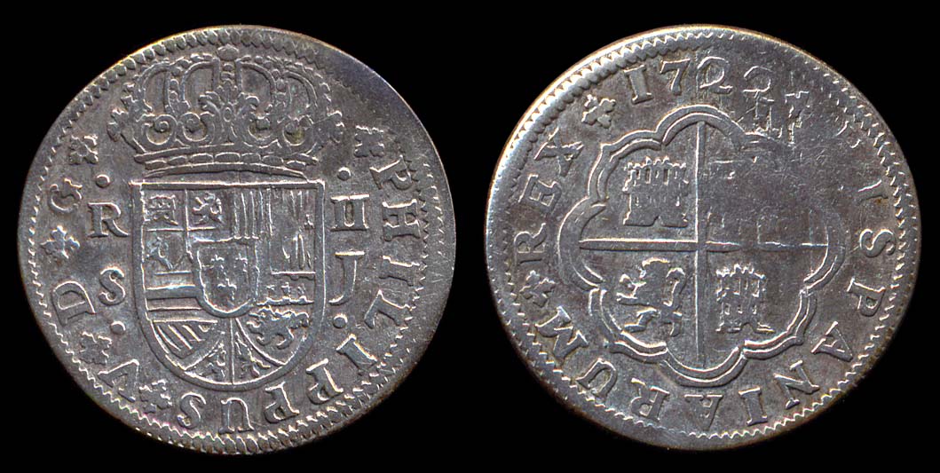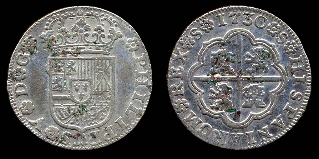 silver 2 reales K340 1730-S recut 7, bits of crust, VF $62.00