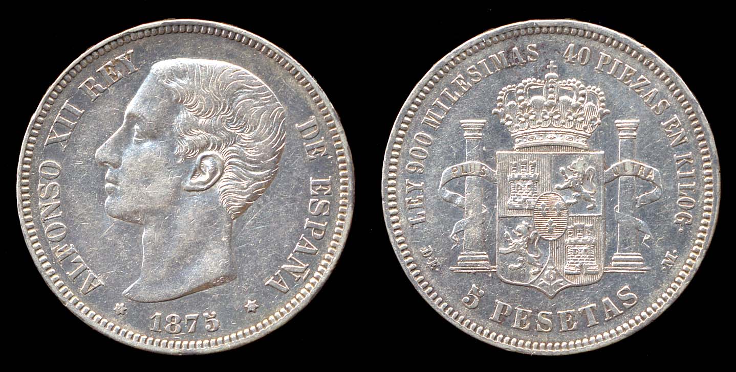 5 pesetas K671 1875, star dates visible, minor flaw under chin, XF $145.00