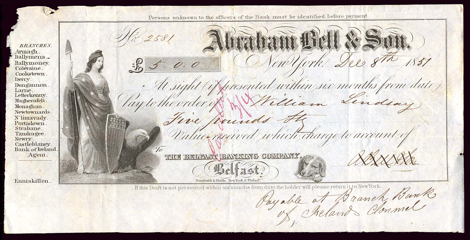 the Belfast Banking Co., 8.12.1851, nice vignette of Liberty & eagle,