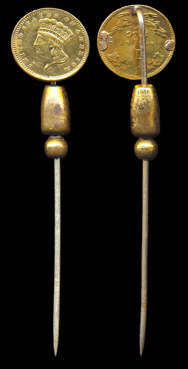 gold 1 dollar 1856 soldered on rev. onto a stickpin, with a gold plated