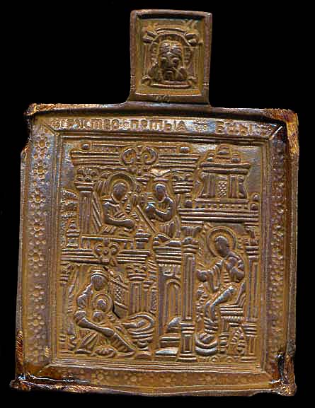 19th c., bronze icon, 69x50mm, Our Lady of Pokrov, central panel