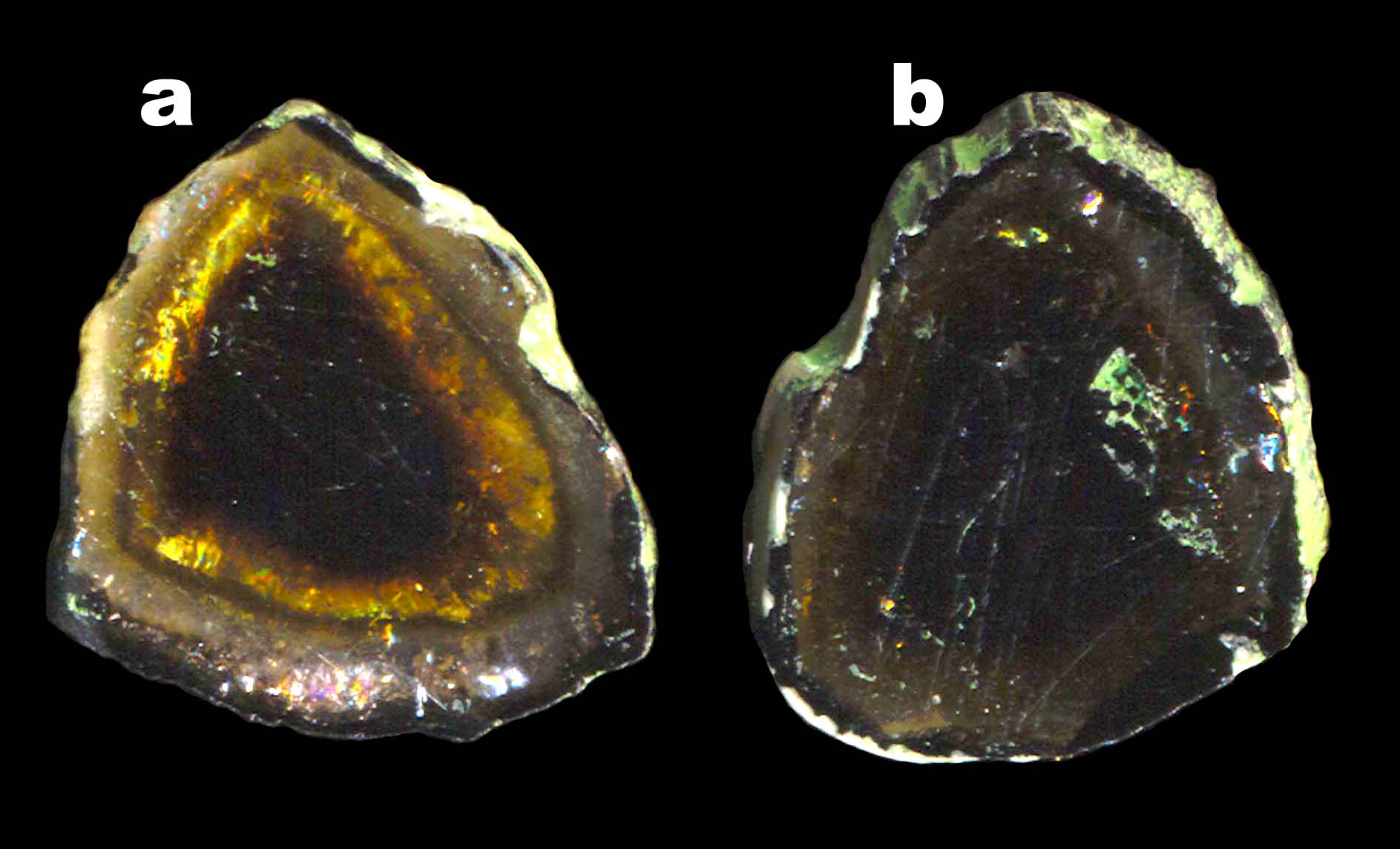 11x12mm polished triangular sections cut from columnar crystal, concentrically