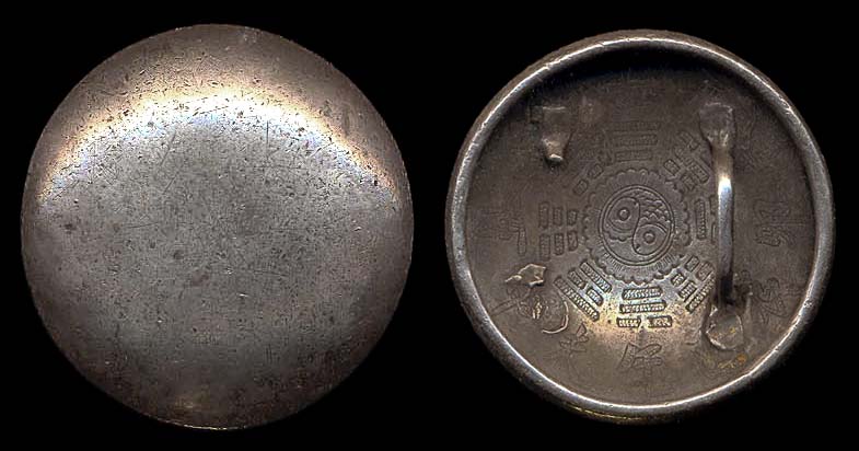 45mm domed circle with loops on back, outside is plain, inside has yin/yang,