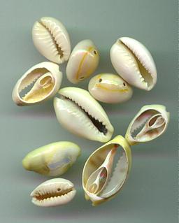 There is a running debate as to whether c. moneta and c. annulus are truly separate species. They exhibit intermediate types, the extremes being the distinct shoulders of c. moneta and the smooth egg shape of c. annulus. Size varies from 0.5 to 1.5 inches. The ranges of the two types overlap, c. annulus growing from the east African coast to the Red Sea and Iran, and c. moneta from the Red Sea, along thePersian Gulf and the Indian Ocean to Sri Lanka, and on through the China Sea to Indonesia and the Philippines. In general no distinction was made between them in trade, and throughout Asia and Africa the two types are often found together. A major "factory" was in the Maldive Islands, the gathered shells being traded to Bengal, from whence they were wholesaled out to the rest of the world.