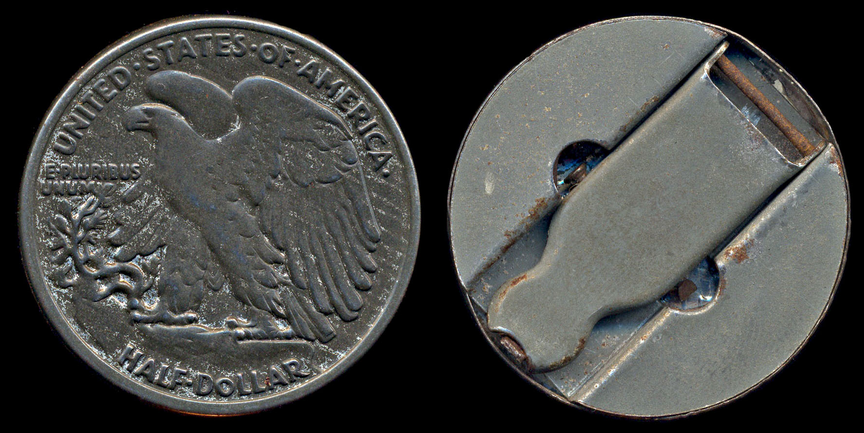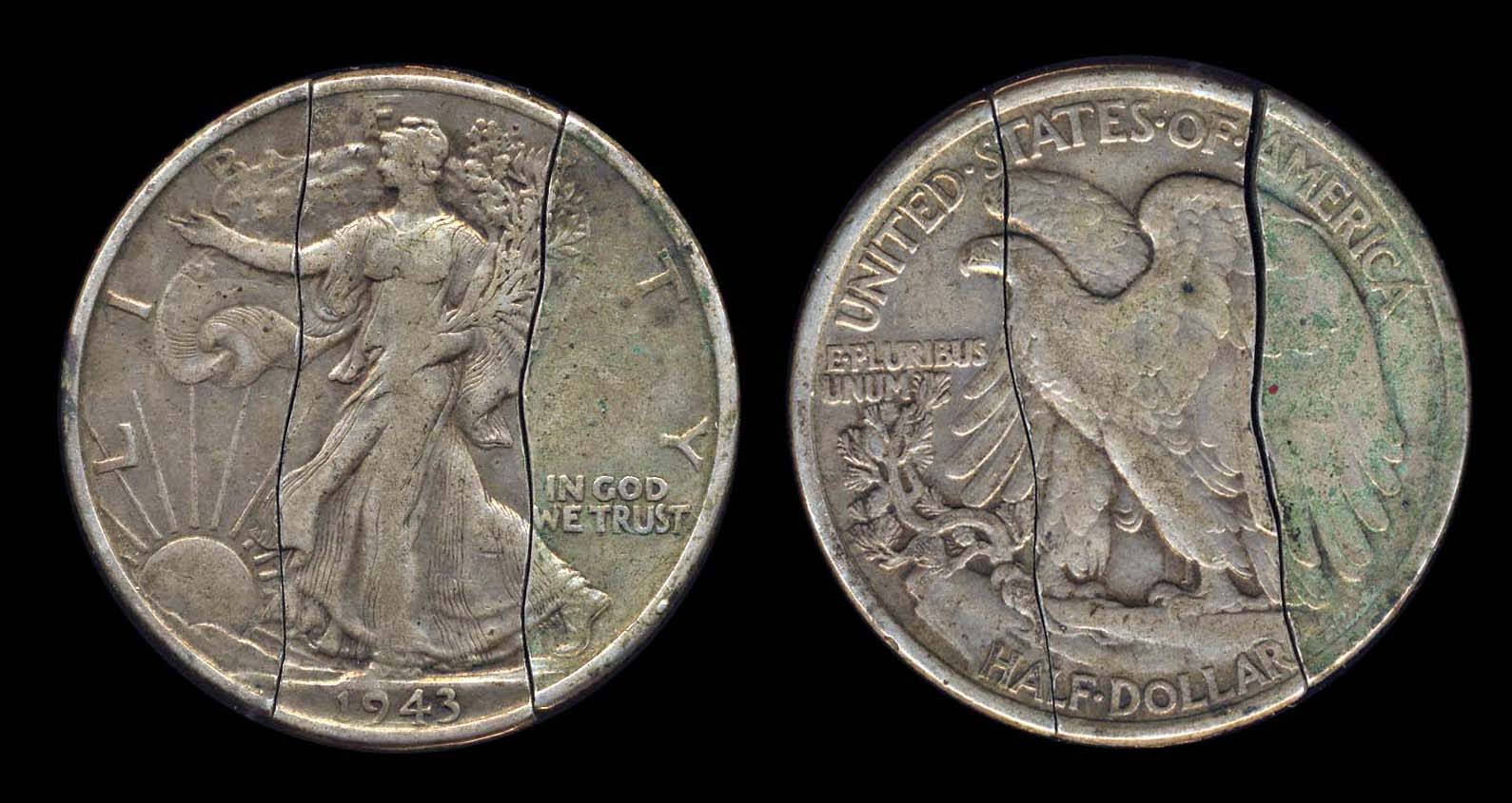 modified coin 1943 half dollar irregularly cut in 3 pieces & slotted around the