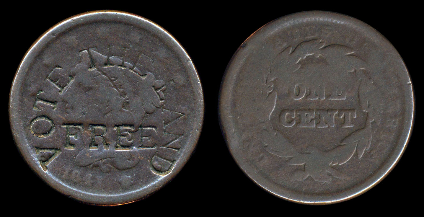 4478 USA, countermarked coin, 1841 1 cent c/m VOTE THE LAND FREE incuse obv. /