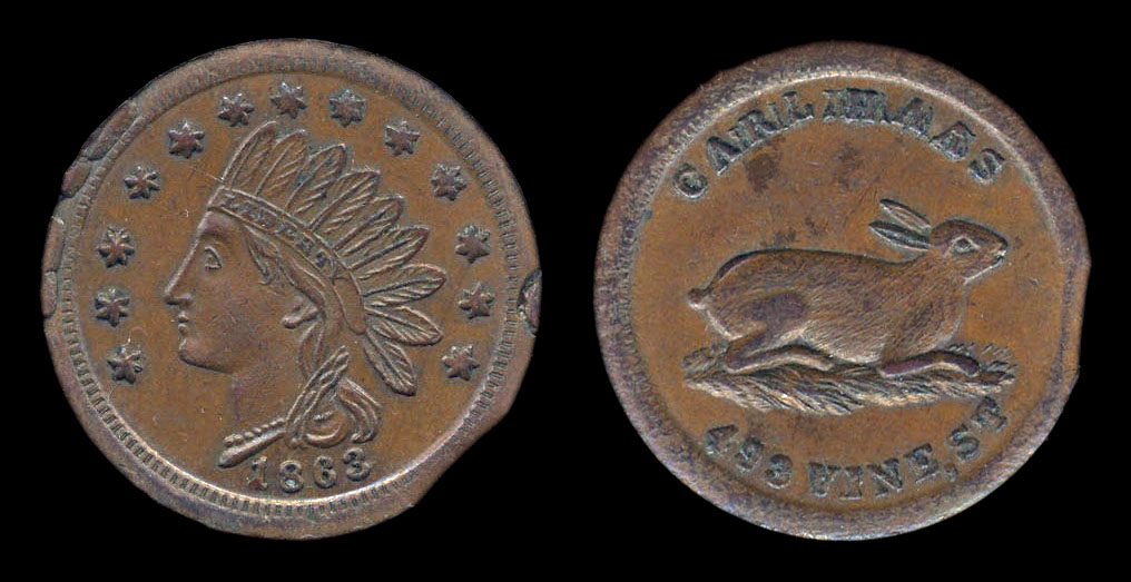 4480 USA, OHIO, Civil War token, 1863 rabbit R, CARL HAAS 493 VINE, ST / Indian