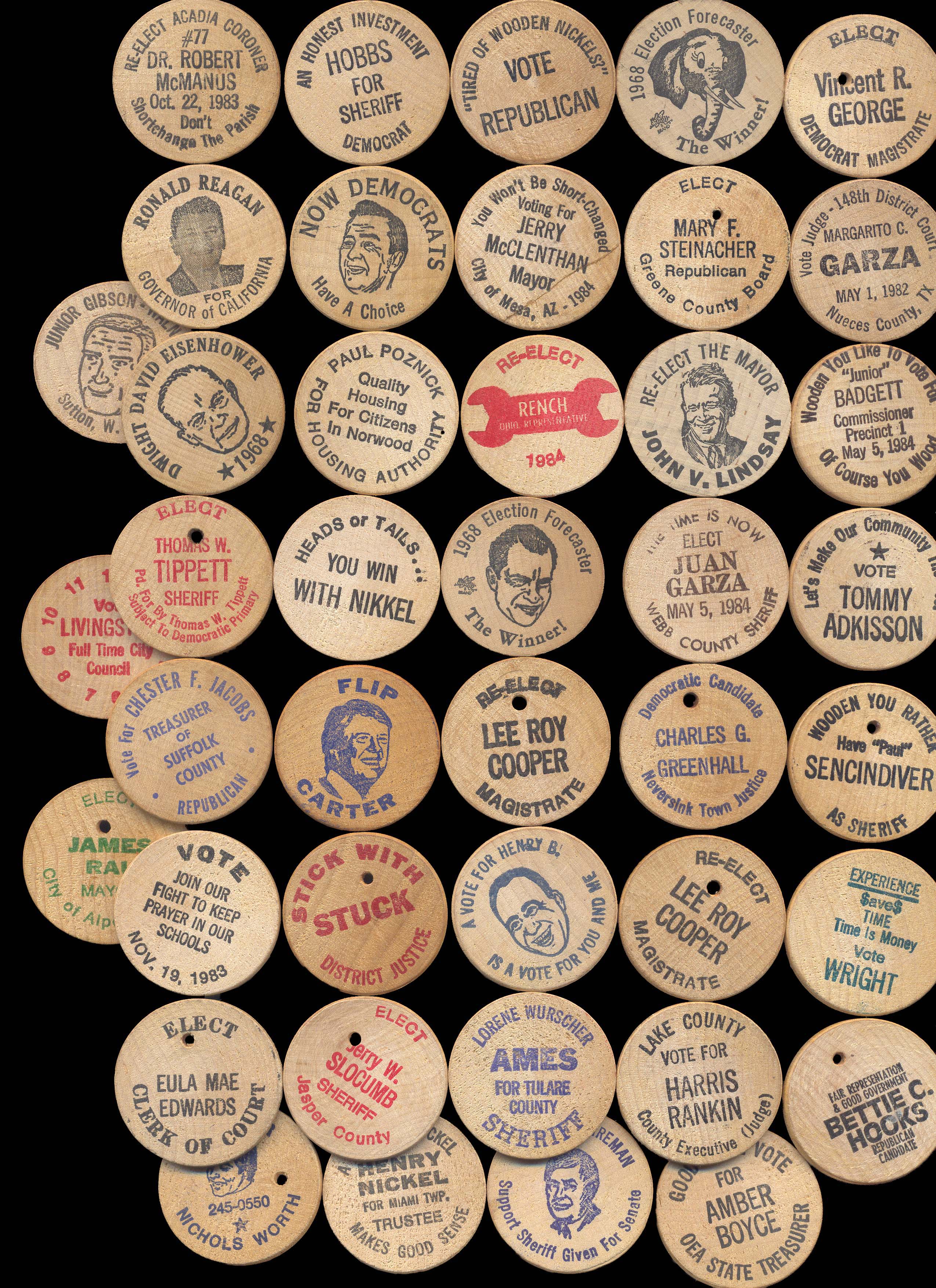 4490 USA, wooden nickel lot, 1960s-80s, all political campaigns, California,