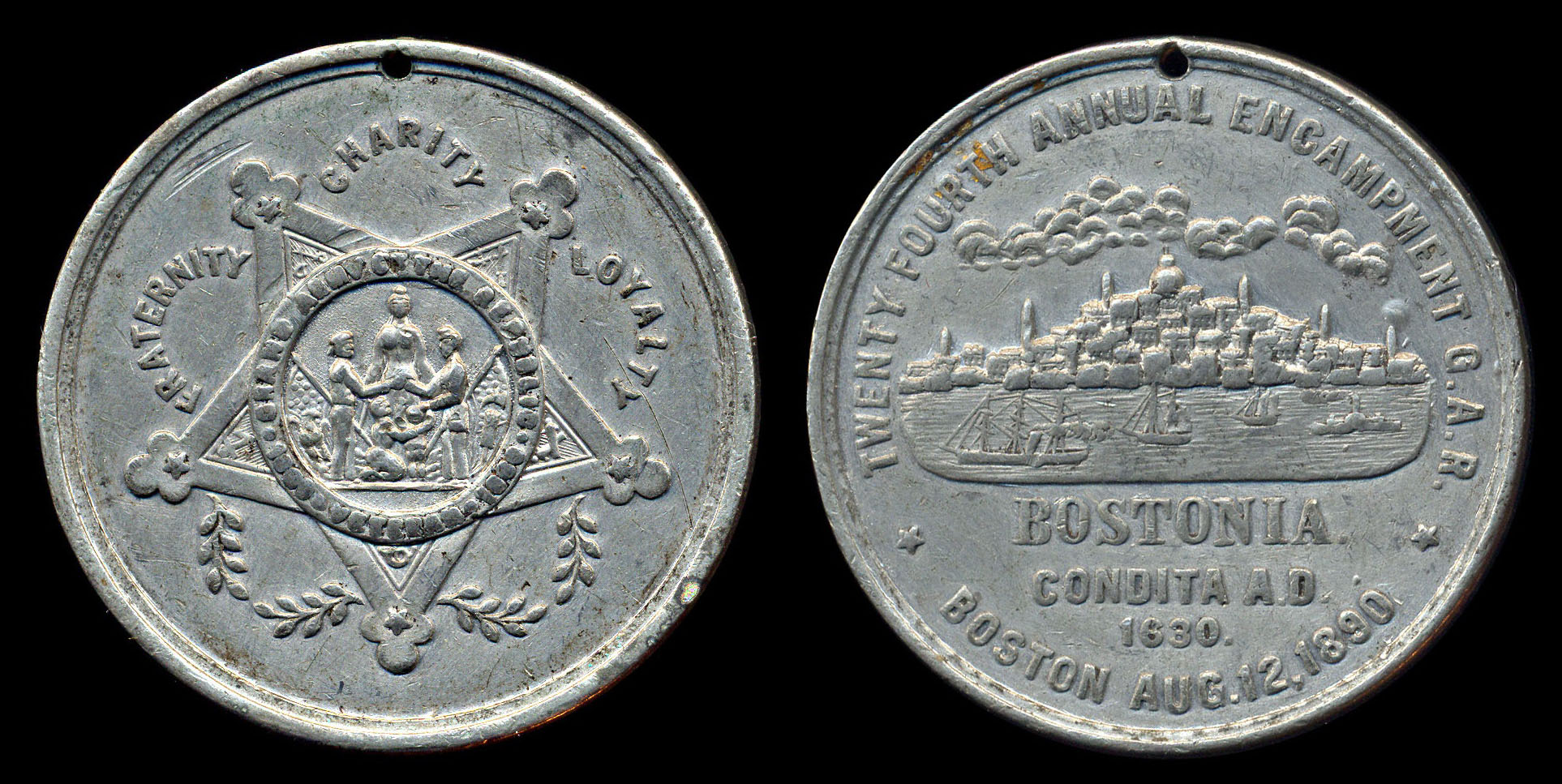 ENCAMPMENT G.A.R. BOSTONIA CONDITA A.D. 1630 BOSTON AUG. 12, 1890, white metal,