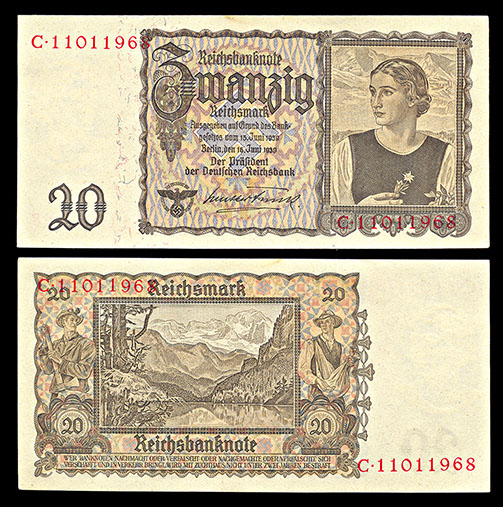 2810 GERMANY, 20 mark 16.6.1939 woman, P185 Unc $26.00