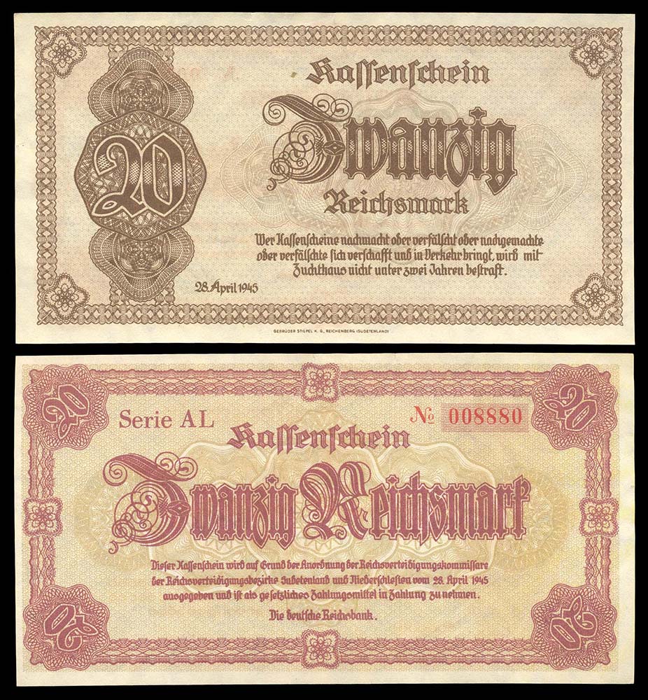 4408 GERMANY, SUDETENLAND, 20 mark 28.4.1945 ser. AL, P187 XF $14.00