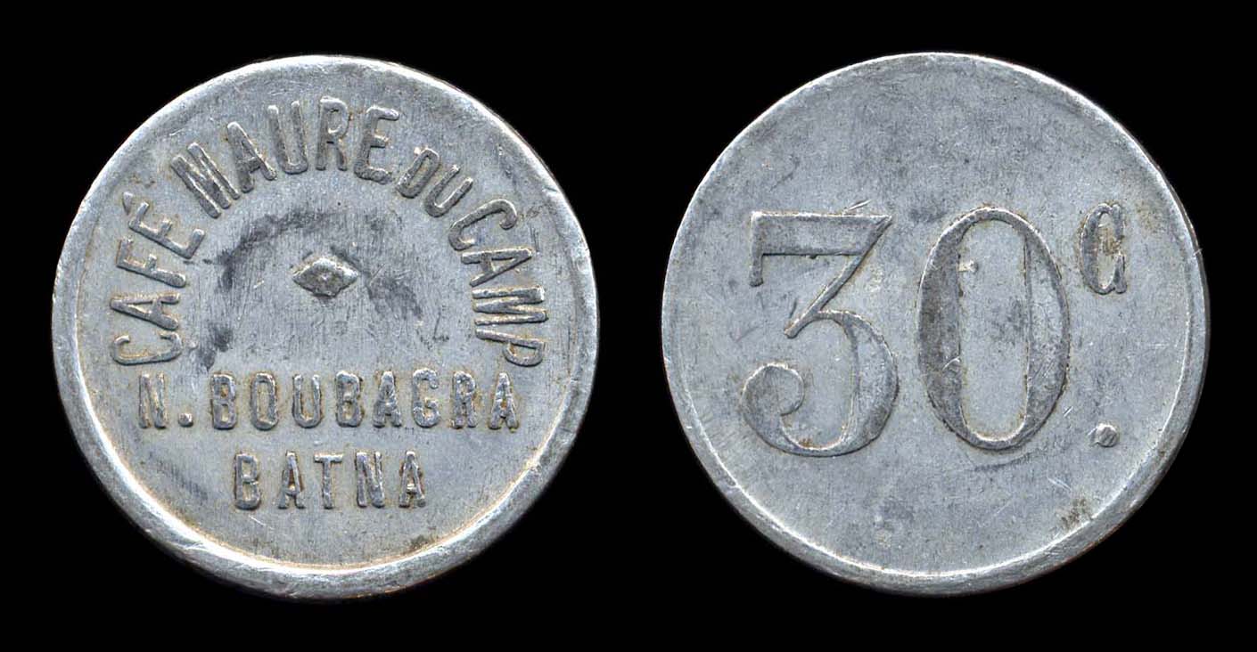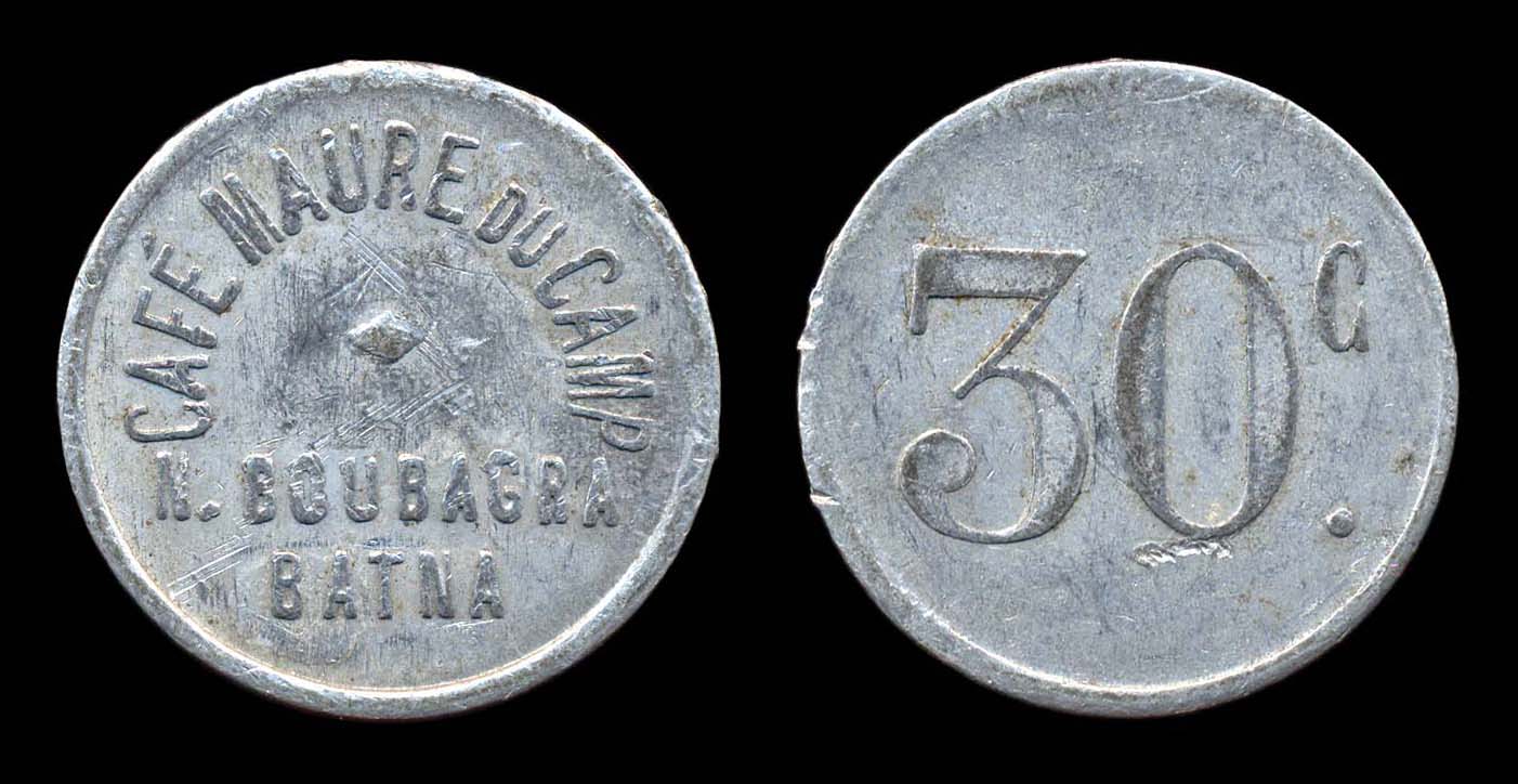 4476 MOROCCO, ND (1920s?) CAFÉ MAURE DU CAMP N. BOUBAGRA / 30c, aluminum, 26mm,